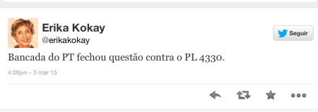 A deputada federal Érika Kokay (PT-DF) anunciou através de sua conta no Twitter, que a bancada do PT na Câmara irá defender a derrubada do nefasto PL 4330.
