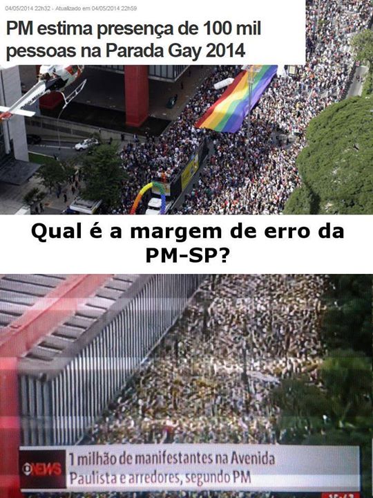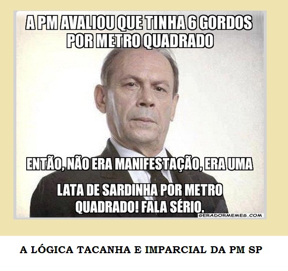 A cúpula da Polícia Militar, sem limites de ludibriação, calculou que havia 6 pessoas por metro quadrado na Avenida Paulista e adjacência, para ridiculamente, chegar ao cálculo de um milhão de pessoas na manifestação dos membros dos PSDB e cia alienada, ou pró golpe de estado.