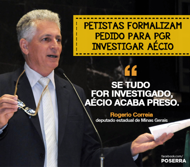 Deputados federais Adelmo Leão e Padre João e o deputado estadual Rogério Correa, os três do PT de Minas Gerais, pediram hoje à Procuradoria-Geral da República para que o senador Aécio Neves (PSDB-MG) seja investigado na Operação Lava Jato; o tucano foi citado pelo doleiro Alberto Youssef como sendo um dos beneficiários da “Lista de Furnas”, esquema de corrupção descoberto em 2006, no qual políticos e partidos teriam recebido dinheiro para ‘caixa dois’ de campanha; petistas afirmam que documentos “apontam, no mínimo, para a necessidade de se iniciar uma investigação” e pedem punição, “com rigor”, de “todos os responsáveis e beneficiários dos delitos eventualmente praticados em desfavor do erário”