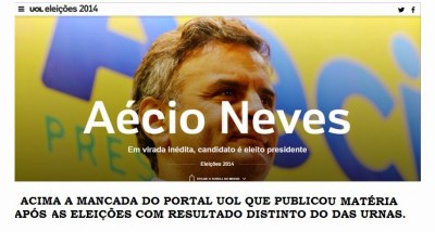 O Portal UOL, que participara da divulgação da fraude contra Dilma Rousseff, programara uma matéria para o horário final da apuração, – em seu site – foi exposta a matéria: “Em virada inédita, Aécio Neves é eleito presidente da República”. (vide matéria, clique aqui).