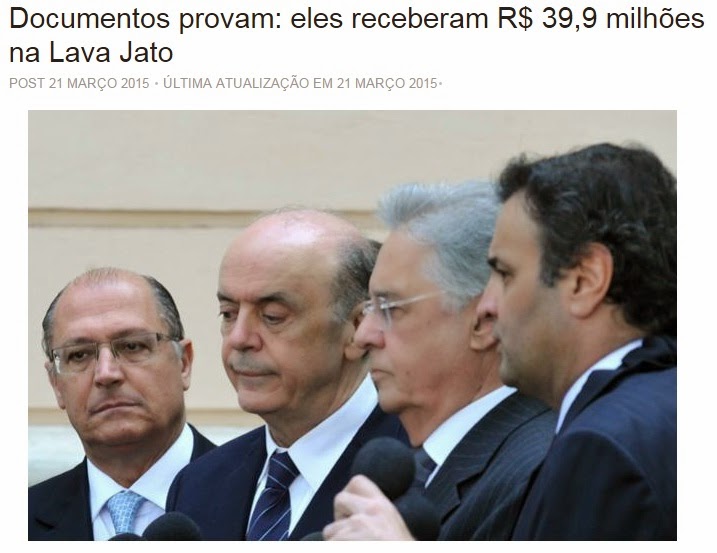 No entanto, a grande imprensa praticamente não refere aos recebimentos de valores por FHC, Alckmin, Aécio e Serra, bem como do PSDB, que receberam dezenas de milhões. E como PSDB, PSB e DEM os valores são superiores a 167 milhões de reais. E somente agora, tendo em vista a divulgação via redes sociais e na internet de depoimentos originais do processo da Lava Jato, que nunca foi segredo para a grande imprensa, elas são obrigadas a ficarem mais fiéis aos fatos, e, começam a falar envolvimentos de Aécio, PSDB, entre outros.